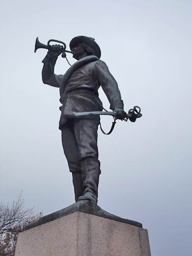 The Call to Arms statue is of a Civil War bugler in uniform holding |